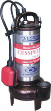 The pump UNIQUA CESSPIT has an electric motor together with a rotor, which create a compact hermetic piece with suction hole located at the bottom of pump. The pump is single-stage with impeller of type Vortex. The electric motor is single-phase, asynchronous and is protected against penetration of the pumped liquid by a mechanical seal, an oil casing (filled with rafined rape oil) and a lip seal. The motor is fitted with a thermal winding protection against overheating (the motor is also protected against destruction for a short time). The connect cable is perfectly sealed by a special bushing and is protected against penetration of the pumped water. The user is obligated to protect the motor against overload by a current circuit breaker (see the connection diagram). The product is protected by the utility model and patent.
