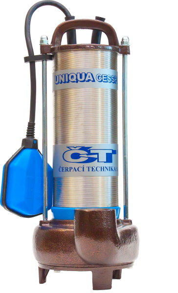 Submersible sludge pump UNIQUA CESSPIT is used for transferring and draining water, sediments and feces. To use the pump for pumping flammable liquid, toxic liquid substance (acid, alkali) is forbidden! To use the pump in a place with a threat of explosion is forbidden too. The producer can make pumps with a different length of cable compliance according to the wish of a costumer. The pumps can by used in vertical, horizontal or tilted position.